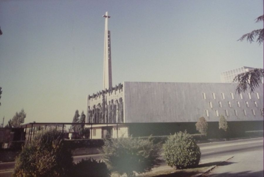 | Vista antigua del Santuario desde el Colegio de La Virgen del Camino. Bajo la carretera transcurre el túnel por el que se accede al Santuario. (SVC) |