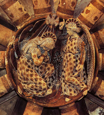 Primero, arriba, La Anunciación con el arcángel San Gabriel (aquí sin alas) y la Virgen María. A continuación, seis ángeles músicos tocan sus instrumentos envueltos en túnicas y mantos flotantes, sin alas y dejando en el aire si van o no descalzos, pues entre que están colocados a gran altura y que casi todos llevan pies tapados por los faldones, lo poco que se ve no permite apreciarlo.