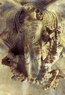 | El ángel del arpa realizado en piedra. Obsérvense las manos |
