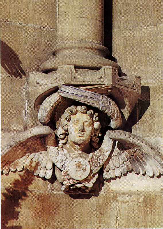 | Difíciles de distinguir por estar tallados e integrados en una piedra similar a la fachada, seis ángeles rodean el anagrama de Jesus, "JHS" |