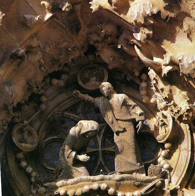 | Para cerrar, el ángel situado a la izquierda de uno de los portales centrales de la fachada del Nacimiento, gemelo del mostrado al principio. |