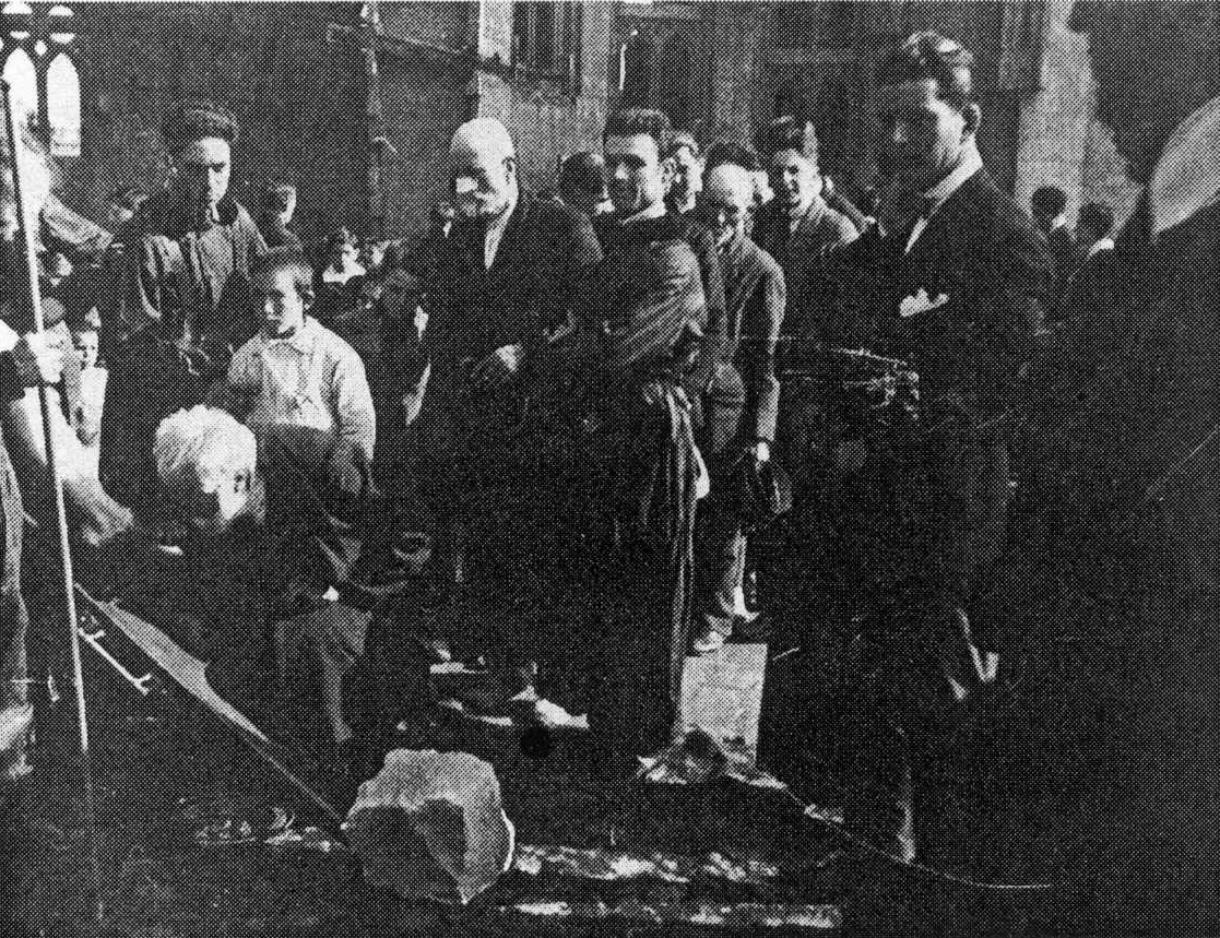 | A la izquierda, Antonio Gaudí hace una genuflexión para besar los pies de Cristo. Tras él, con un vendaje en la nariz, Lorenzo Matamala |