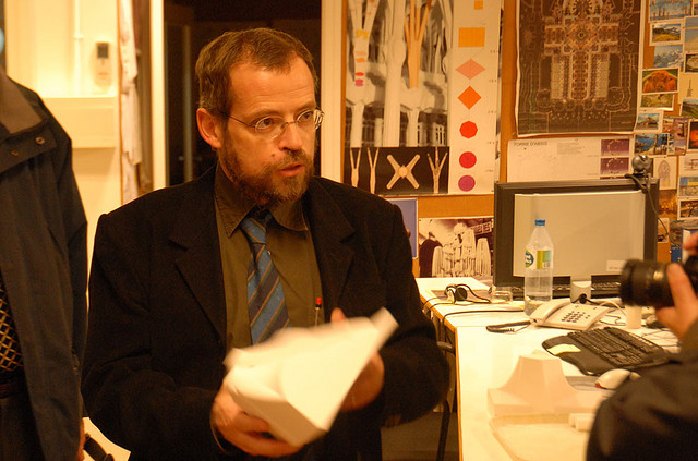 | Jordi Faulí en la nave en obras. 2000 (A.Mª.F.) |