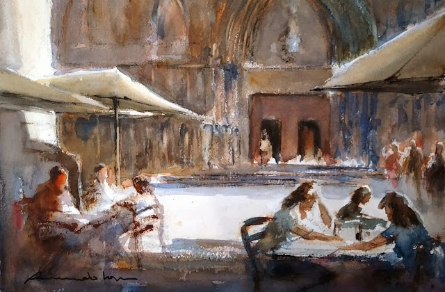 Del mismo modo que tampoco he utilizado en ningún momento las palabras pintor, acuarelista, dibujante o artista, para referirme a la referida. Para mí tales calificativos tienen un gran valor, con ellos aprendí a ver y mirar un mundo que disparaba mi curiosidad haciéndome imaginar qué historias estarían sucediendo tras los balcones de la calle Caputxes, o por qué la plaza de mi colegio era mucho más atractiva pasada por sus pinceles. Ni olvido su simpática paciencia al contestar las preguntas que les hacían los personajillos que se pegaban a ellos, quizá soñando que un día serían capaces de imitarlos.