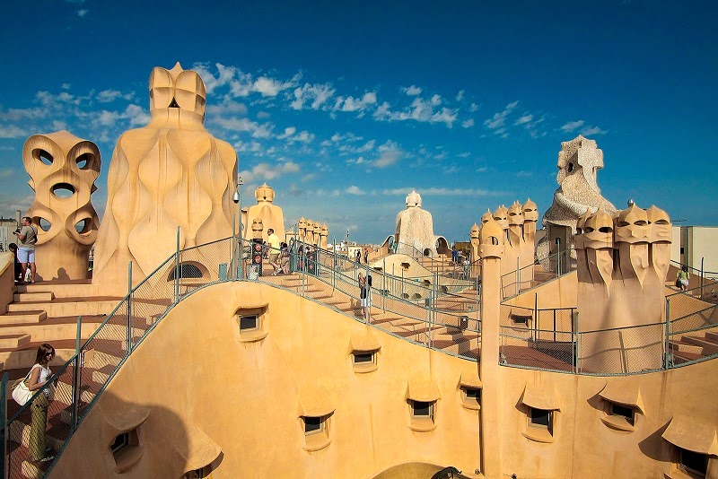 El inmueble de la calle Provenza/Paseo de Gracia acabó cubriéndose con seis terrazas a distintos niveles. Pero aún faltaba el toque definitivo sin el cual la Casa Milà no hubiera sido lo que su creador tenía en mente. Faltaban las salidas de escalera, de humos, de ventilación. En realidad, esculturas orgánicas, burbujas expulsadas por la agitación de un mágico caldero de piedra. Visto desde arriba, el edificio es un universo marino, ondulación de olas y espumas en las que flotan caracolas y piedras moldeadas por las aguas. Desde abajo la impresión es geológica, coronada por nubes. Según la procedencia del observador, así se etiquetan los acantilados de su montañosa fachada, Sierra de Prades, de la Mussara, Montserrat, Mallorca, Turquía, Irán...