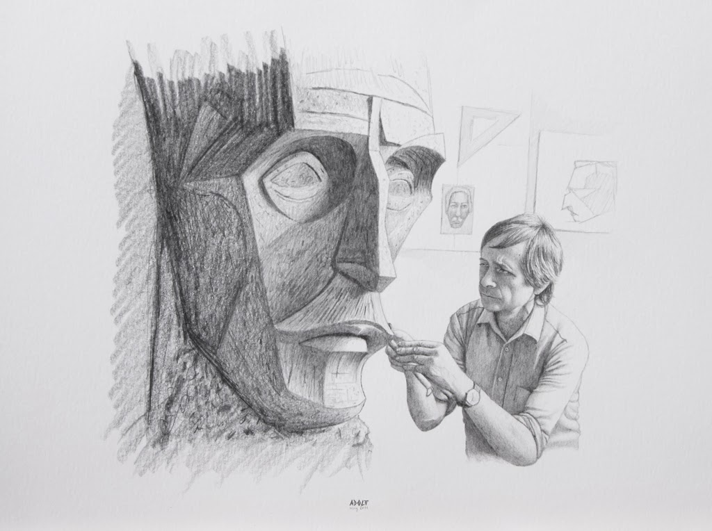 | Trabajando en A Macià, para Vilanova i la Geltrú. Retrato de Subirachs por ADOLF. 2011 www.adolf.cat |