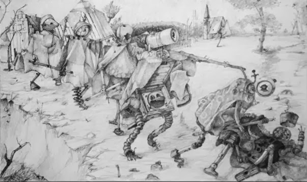 Martín Pérez Agripino atrapa el tema y nos lo sirve con el fondo de ladrillos ante el que desfilan siete figuras, entre la desesperanza de un mundo que al autor bonaerense no le inspira mucha confianza. Norberto Fuentes, seguidor del proyecto Drap Art, que promueve la reutilización y el reciclaje en el arte, nos presenta su Parábola con un dibujo en grafito repleto de imaginación. Tuercas, muelles, tornillos, tuberías, componen su original desfile de invidentes, que aquí vuelven a ser seis.