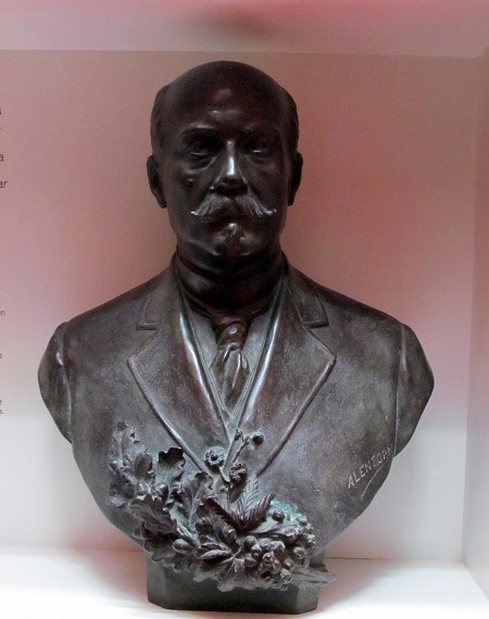 | Dos imágenes de Ferrán Alsina Parellada. En fotografía de juventud, y ya en su madurez, en el busto obra de Eduard Alentorn que se encuentra en el MNACTEC de Tarrasa. |