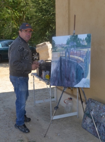 Es la gran fiesta de los pintores en Frómista, donde este año se han inscrito 32 participantes. Por calles y alrededores reinan los artistas. Unos, repetidores del Certamen. Otros debutan este año y lógico, casi todos ellos plantan su caballete en una de las dos iglesias principales o junto al paso del Canal de Castilla. Pero dará igual. Te fijas en los seis que se agolpan juno a la esclusa, casi codo con codo, para comprobar que cada uno de ellos está absorto, plasmando su mundo. Ves a los instalados bajo los soportales de la calle, frente a San Martín y San Pedro, y sus obras nada tienen en común.