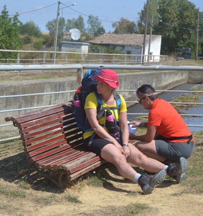 Peregrinos. Unos saludando a la fotógrafa y otras descansando las