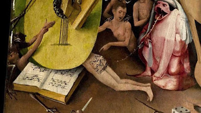 Me ha encantado esta entrada por varias razones. En primer lugar porque El Jardín de las Delicias es una obra que me entusiasma, visita obligada siempre que caigo por el Museo del Prado: una diablura imaginativa, surrealista y, en cierta forma, transgresora. En segunda lugar, por mi afición a la música. Lo del pentagrama escrito en el trasero del condenado, lo que vienes a definir como la música considerada un instrumento de tortura, me recuerda ciertas composiciones insufribles e incomibles (aquí cada uno pone las suyas). No es este el caso. La pieza es simpática y jovial, no parece adecuada para hacer sufrir a los pobres mortales. Y la pieza atresillada del maestro Paniagua es sencillamente una delicia.
