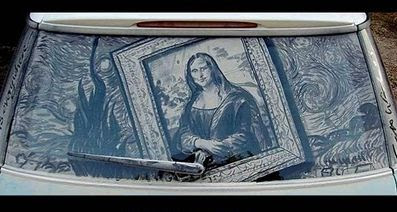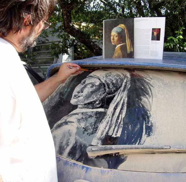 Aunque habrá exquisitos que se burlen de este simpático pionero del Arte Efímero echándose las manos a la cabeza y tildándolo de friki –cosa increíble después de ver las tomaduras de pelo que se cuelan en nuestros museos, pagadas con nuestros impuestos y avaladas por afamados críticos-, una nueva rama del arte popular ha surgido a partir del polvo, de la mano de Scott Wade. Porque una cosa es escribir con el dedo en un cristal No lo laves, siembra patatas, y otra muy distinta, que a partir de ir quitando porciones de polvo con un pincel seas capaz de reproducir en la luna trasera de un coche La Joven de la Perla, La Gioconda, El Nacimiento de Venus, La Creación de Adán de la Capilla Sixtina, plasmar escenas de mafia y terror que para sí hubieran querido Coppola o Paul Naschy o ya en plan festivo, alegrarle la vista al automovilista trasero mostrándole a un grupo de cinco lozanas bávaras sirviendo jarras en la Oktoberfest de Munich.