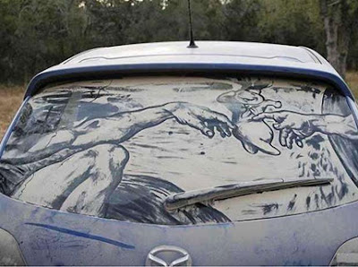 Asombroso, Ana. Mientras algunos jocosos habrían advertido al dueño del vehículo de su condición de cochino por tener un coche tan sumamanete sucio, este artista original desarrolla un arte efímero que causa impresión. ¡Genial!